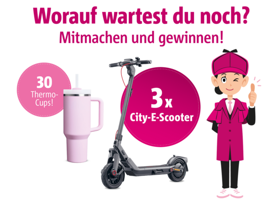 In 2 spannenden Spielphasen erwarten Dich knifflige Rätsel und spannendes Wissen rund um Tebonin®! Nach jeder erfolgreich abgeschlossenen Spielphase hast Du die Chance auf 1 von 15 Thermo-Cups! Hast Du beide Spiele erfolgreich gelöst, bist Du im Lostopf um 1 von 3 City-E-Scootern! Nimm jetzt an der 1. Spielphase teil und sei gespannt, was Dich in der 2. Spielphase erwartet. Ab dem 01.07.2026 wird auch die 2. Spielphase live sein.